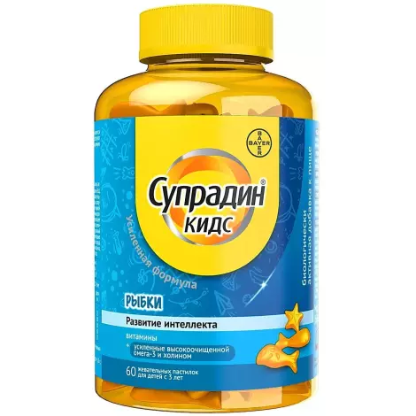 Супрадин® кидс рыбки. Усиленная формула. Развитие интеллекта + витамины усиленные высокоочищенной омега-3 и холином.