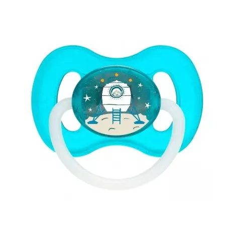 Пустышка выполнена с классической круглой соской и специальными вентиляционными отверстиями на нагубнике, что обеспечивает хорошую циркуляцию воздуха, предотвращая появление раздражений и покраснений на коже малыша. Кольцо, которое светится в темноте, позволяет легко находить пустышку ночью, не разбудив ребенка. Яркий и привлекательный дизайн, а также удобная форма делают пустышку идеальным выбором для детей и их родителей.