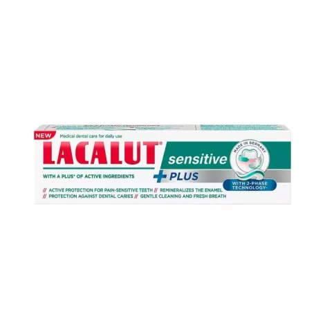 Зубная паста Lacalut Sensitive Plus содержит хлорид калия для снижения чувствительности зубов и комплекс гидроксиапатита и фторида натрия для укрепления эмали. Снижение чувствительности достигается уже после нескольких чисток.