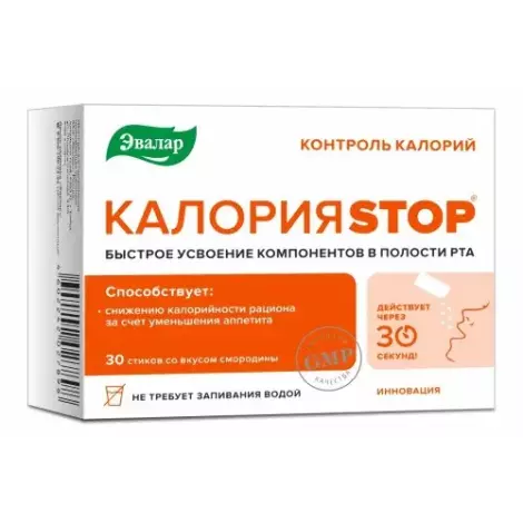 КАЛОРИЯSTOP — биологически активная добавка к пище. Инновационный комплекс высокоактивных растительных экстрактов и хрома в форме порошка для рассасывания в стиках. Благодаря быстрому усвоению компонентов в полости рта, действует уже через 30 секунд! Активное вещество: Экстракты гарцинии, худии, зеленого кофе, зеленого чая, хром Действие: Снижение калорийности рациона за счет уменьшения аппетита