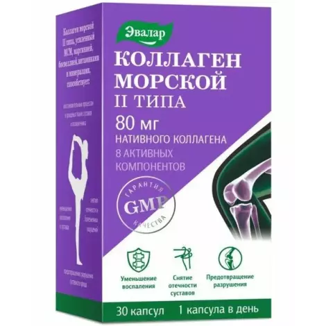 Коллаген морской II типа в капсулах от компании «Эвалар» — инновационная формула, которая содержит нативный коллаген из глубоководного кальмара и еще 7 ингредиентов, важных для здоровья суставов. Самая распространенная дозировка нативного коллагена — 40 мг. Ее достаточно, так как нативный коллаген работает иначе, чем обычный. Благодаря сохраненной природной структуре он не разрушается пищеварительными ферментами и поступает в кишечник в неизменном виде. Распознаваясь организмом как «родной», нативный морской коллаген сразу же включается в процесс восстановления суставов.