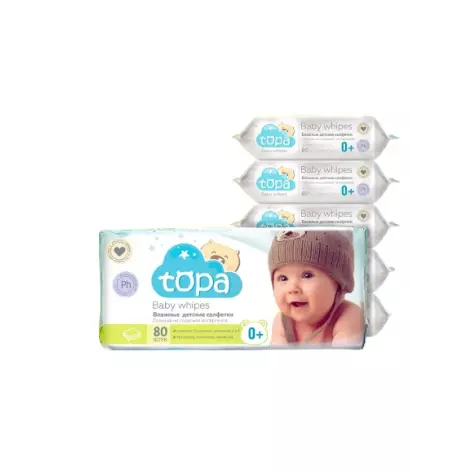 Салфетки Topa можно использовать в комплексном уходe: для умывания лица и рук, протирания тела и для интимной гигиены младенца.