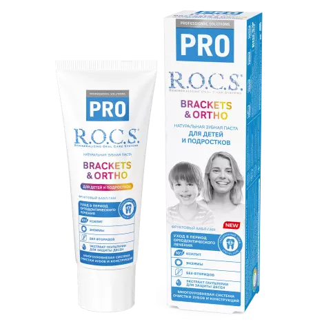 Уникальная зубная паста R.O.C.S. PRO Brackets & Ortho для детей и подростков содержит протеолитический фермент бромелаин, позволяющий очищать зубы на участках, недоступных зубной щетке. Специальные деликатные гранулы усиливают очищающие свойства пасты. Кроме того, бромелаин в сочетании с ксилитом снижает адгезию бактерий и замедляет налетообразование, устраняя факторы воспаления и обеспечивая длительную чистоту зубов и десен.