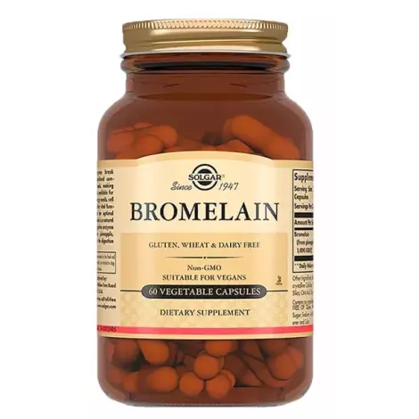 Бромелайн — это пищеварительный фермент, выделенный из ананаса. «Бромелайн» способствует пищеварению, расщеплению белковой пищи и усвоению ее организмом, а также рекомендуется в качестве дополнительного средства для уменьшения воспаления, отека и ускорения восстановления тканей при спортивных травмах, ушибах, растяжениях.