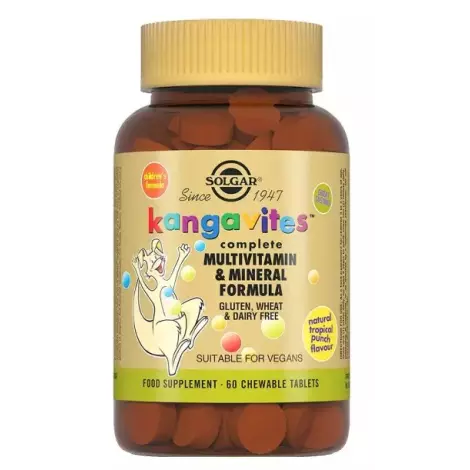 «Кангавитес. Комплексная формула мультивитаминов и минералов со вкусом тропических фруктов» — мультивитамины для детей в жевательных таблетках, богатые витамином С, фолиевой кислотой, биотином, кальцием, магнием. Также комплекс мультивитаминов и минералов Кангавитес от Солгар содержит селен, хром и соевый лецитин. Стимулируя функции роста и развития, данный продукт снабжает организм веществами, необходимыми для развития и поддержки тканей и систем организма, содействует нормальному функционированию нервной и мышечной системы, а также улучшению памяти и мозговых функций. «Кангавитес™. Комплексная формула мультивитаминов и минералов со вкусом тропических фруктов» выпускается в форме жевательных таблеток, подслащенных фруктозой и ароматизированных натуральными экстрактами тропических фруктов и овощей. Также данный комплекс содержащих биофлавоноиды цитрусовых, экстракты брокколи, красной свеклы, моркови, абрикосов, яблок, клубники и шиповника и удовлетворяет суточную потребность развивающегося организма в витаминах и минералах.