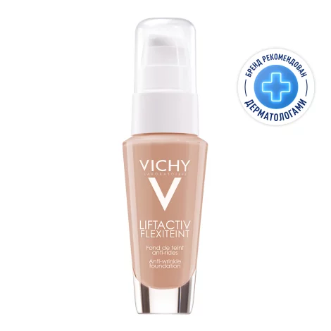 Действие на молодую, упругую кожу тонального крема: ложится ровно. Однако с возрастом на коже появляются морщины. Тональный крем ложится неравномерно. Он скапливается в морщинах, визуально делая их более заметными. Открытие VICHY: тональный флюид Liftactiv Flexilift Teint с двойным действием. Текстура на силиконовой основе не стягивает кожу и не позволяет тональному средству скапливаться в морщинах. Коллагил отобранный специалистами Лабораторий VICHY за его эффективность против морщин, изо дня в день разглаживает кожу, создавая эффект лифтинга.